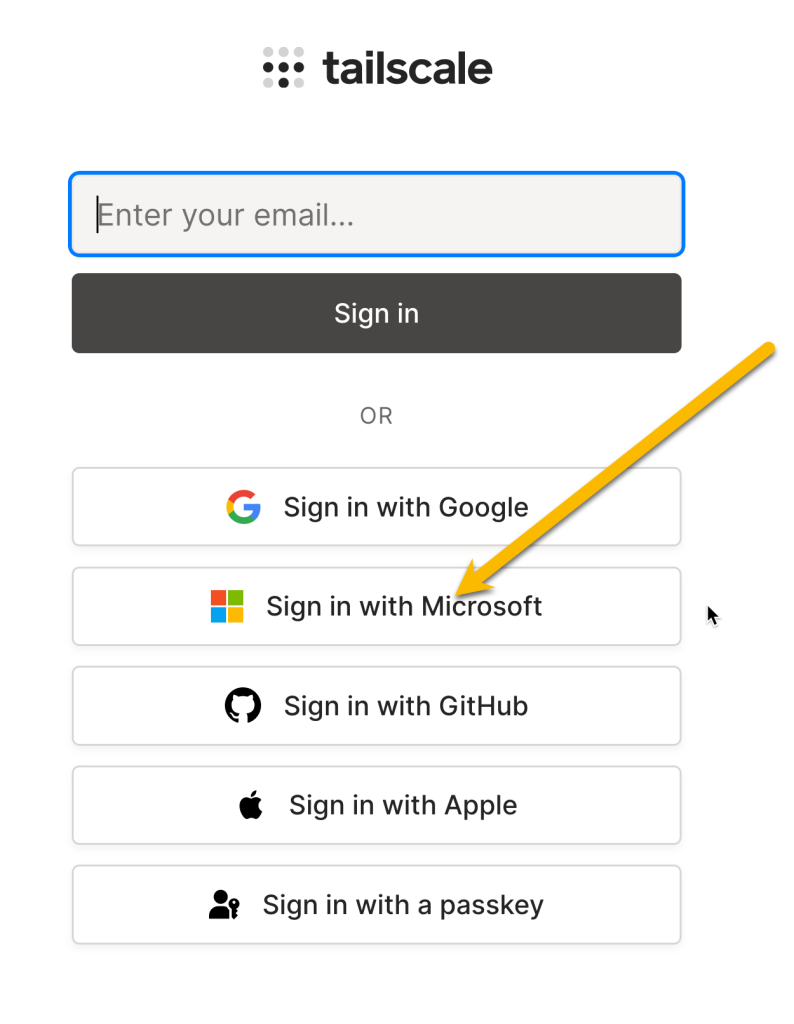 Don’t type in your email address here. Instead Click on the Sign in with Microsoft button. This Login to Tailscale using your Microsoft 365 account will ensure you get paired to the company Tailnet properly.