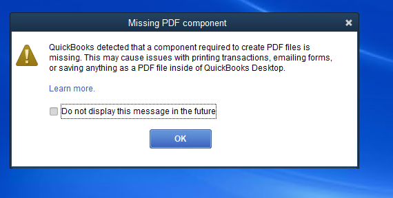Ignore Quickbooks recommendation to use their repair tool to fix the PDF component. It doesn’t work.
