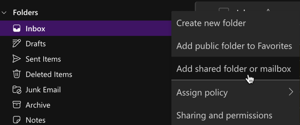 The first method is to add it to the list of folders down the left side. To do this click the 3 dots next to the top word “Folders” just above your Inbox. Select Add Shared Folder or Mailbox. You will be prompted for the email address you have been delegated access to use. The additional inbox will appear further down on the left side of your folder list. You may need to scroll the left side. Adding the address will only need to be done once and will persist every time you open Outlook on the web. Selecting the 3 dots next to the shared mailbox and clicking Remove Shared Folder will remove it from your view.