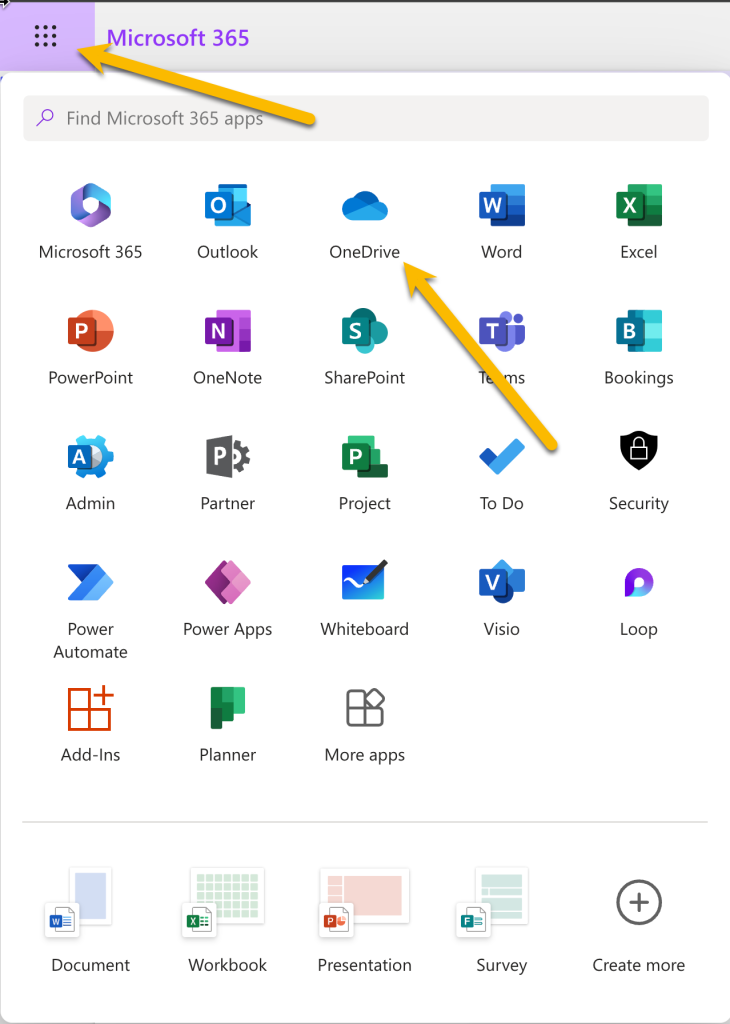 OneDrive is Microsoft’s cloud storage space for files. Go to office.com, login if necessary with your company email address. Then click on the Menu in the upper left, then click on the OneDrive icon.